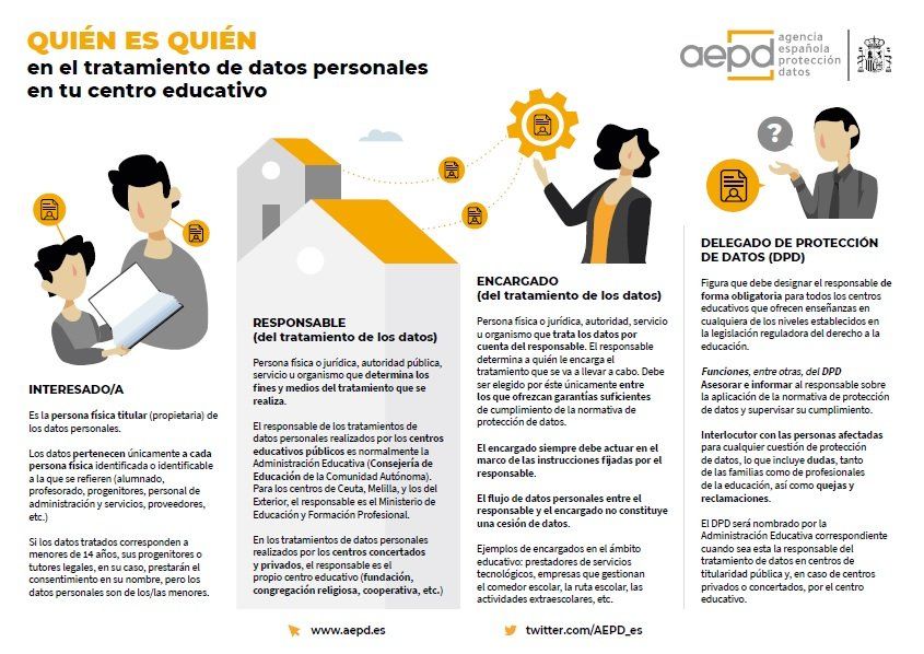 En los nueve primeros meses de este año, el Canal Joven ha recibido más de 1.200 consultas, lo que, a falta de un trimestre para concluir el año, supone casi haber alcanzado la cifra de 2020. Dado el número de preguntas recibidas que inciden en la responsabilidad de los tratamientos de datos en los colegios y qué hacer cuando plantean dudas o controversias al respecto, la Agencia clarifica en esta infografía de quién son los datos que tratan los centros educativos (alumnado, profesorado, personal de servicios, etc.), quién es el responsable de su tratamiento en cada caso, quién gestiona los datos personales atendiendo al encargo que le hace el responsable, y quién tiene la función de asesorar para que el tratamiento se ajuste a la normativa y de responder a las cuestiones y dudas que en esta materia se les susciten a los interesados.